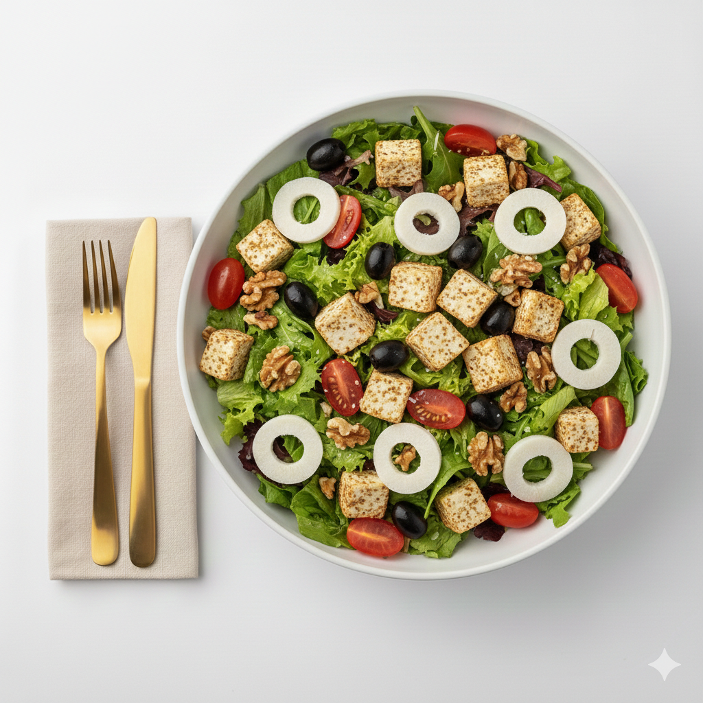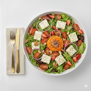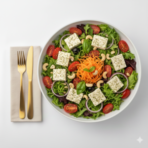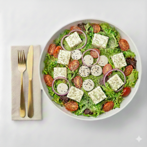 Mix de alfaces com ricota temperada, tomate grape, azeitona preta, palmito, nozes e sementes. Perfil mediterrâneo equilibrado, rico em textura e aromas. Harmoniza bem com molho Pesto.