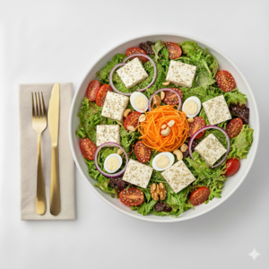 Mix de alfaces com ricota temperada, tomate grape, cenoura ralada, castanha de caju, nozes, ovo de codorna e gergelim. Crocante, nutritiva e rica em textura. Harmoniza com Mostarda & Mel.